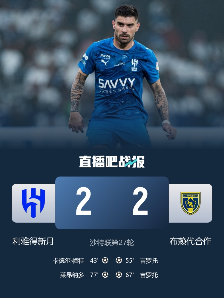 梅特破门,吉罗托双响,莱昂纳多打入扳平球;利雅得新月积65分排名第二,布赖代合作积46分排名第五。