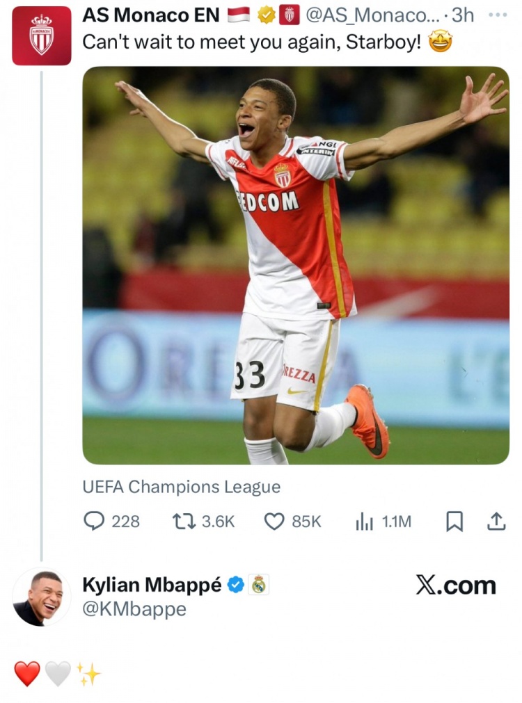抽签结果公布后,摩纳哥官方推特发布了一张姆巴佩效力时期的青涩照片,并配文称:“已经等不及再次见到你,我们的闪耀之星!”姆巴佩在社交媒体下方用摩纳哥主场的红白配色爱心“❤️🤍”作出回应。