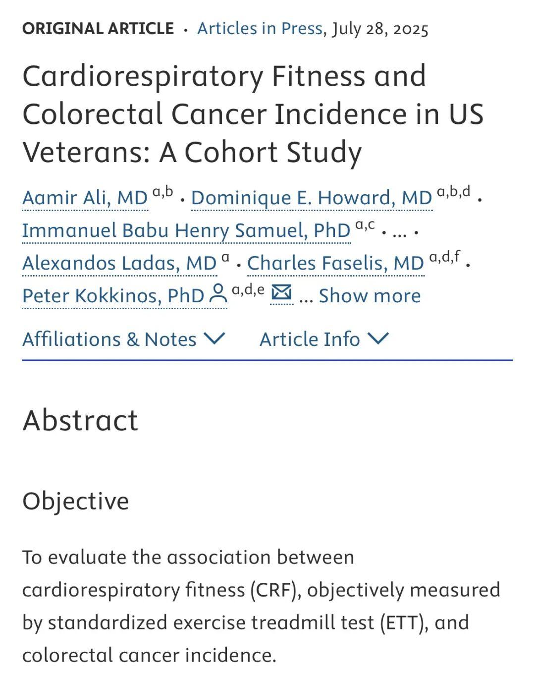 比如,一个多月前《梅奥诊所学报》上刚发了一篇对 64.3 万名美国退伍军人的研究,研究发现运动体能水平最高的人群,在十年随访中得肠癌的可能性只有体能最差人群的一半。