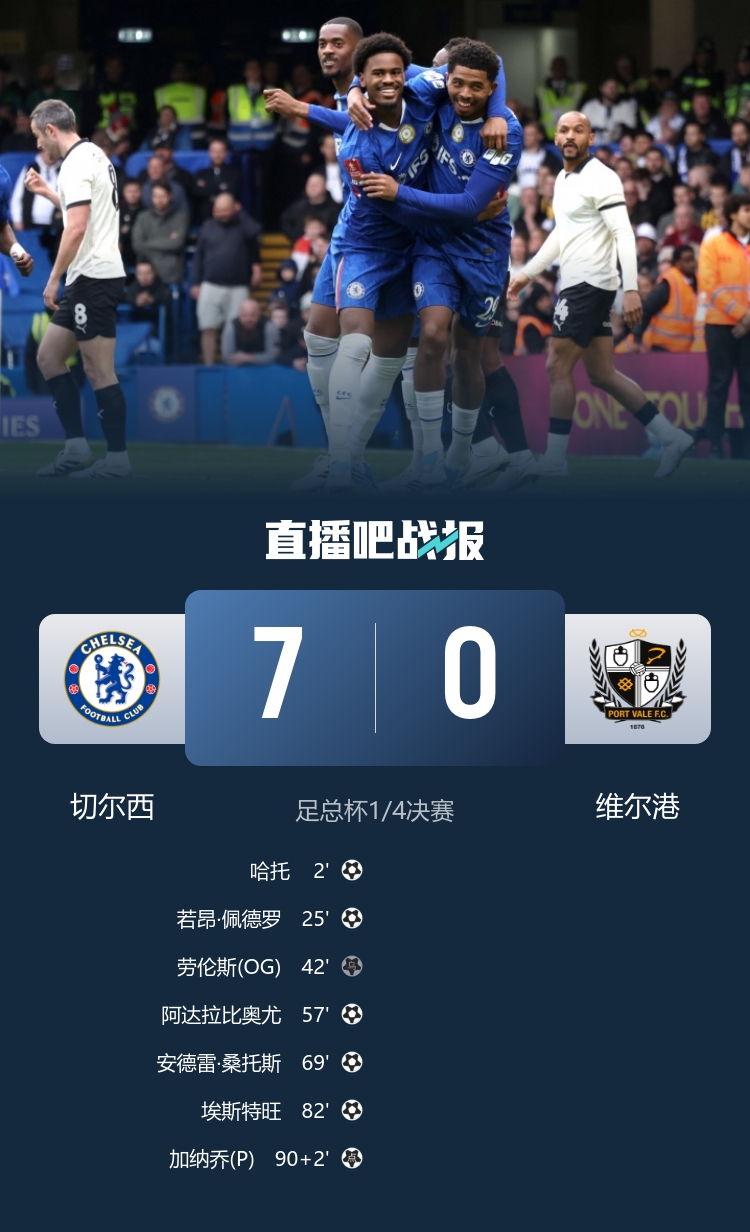 切尔西晋级足总杯4强!埃斯特旺传射,加纳乔点射,佩德罗、哈托、桑托斯建功,恩佐内部停赛。