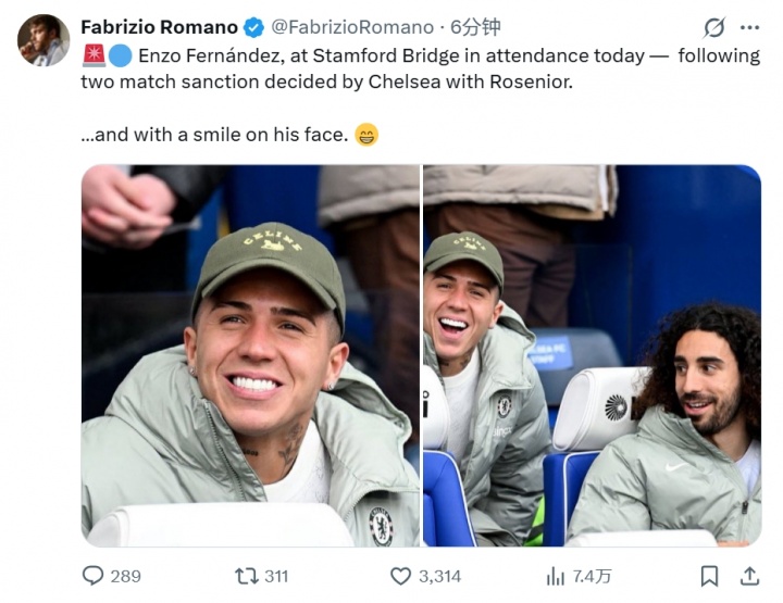 恩佐因为此前言论,被切尔西内部处罚禁赛两场。今天恩佐现身斯坦福桥观战,看起来心情不错。罗马诺发文报道。